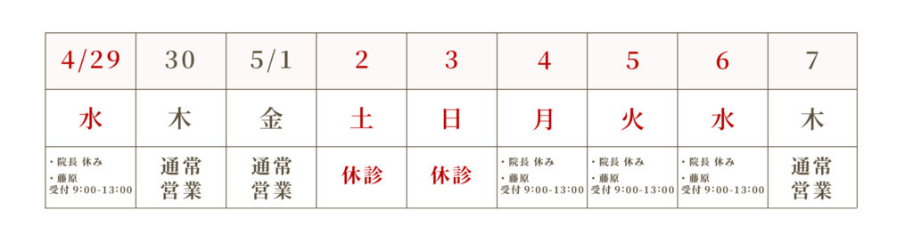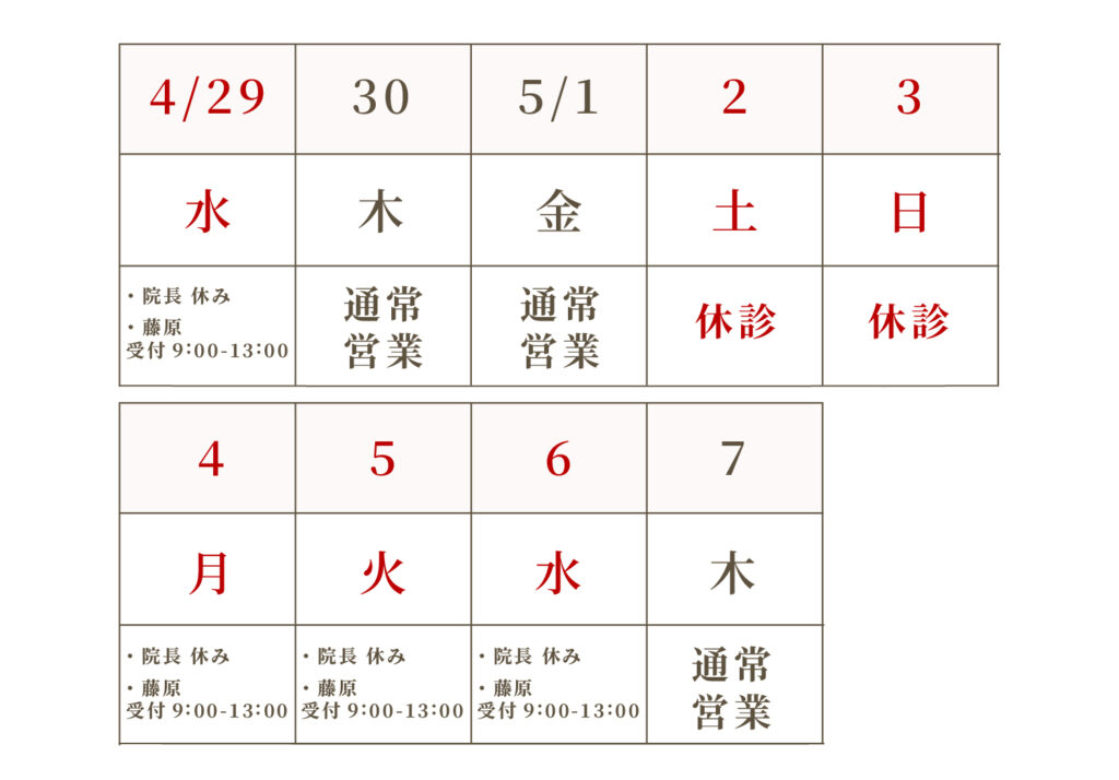 ゴールデンウィーク期間中は、通常とは異なる施術体制となっております。
