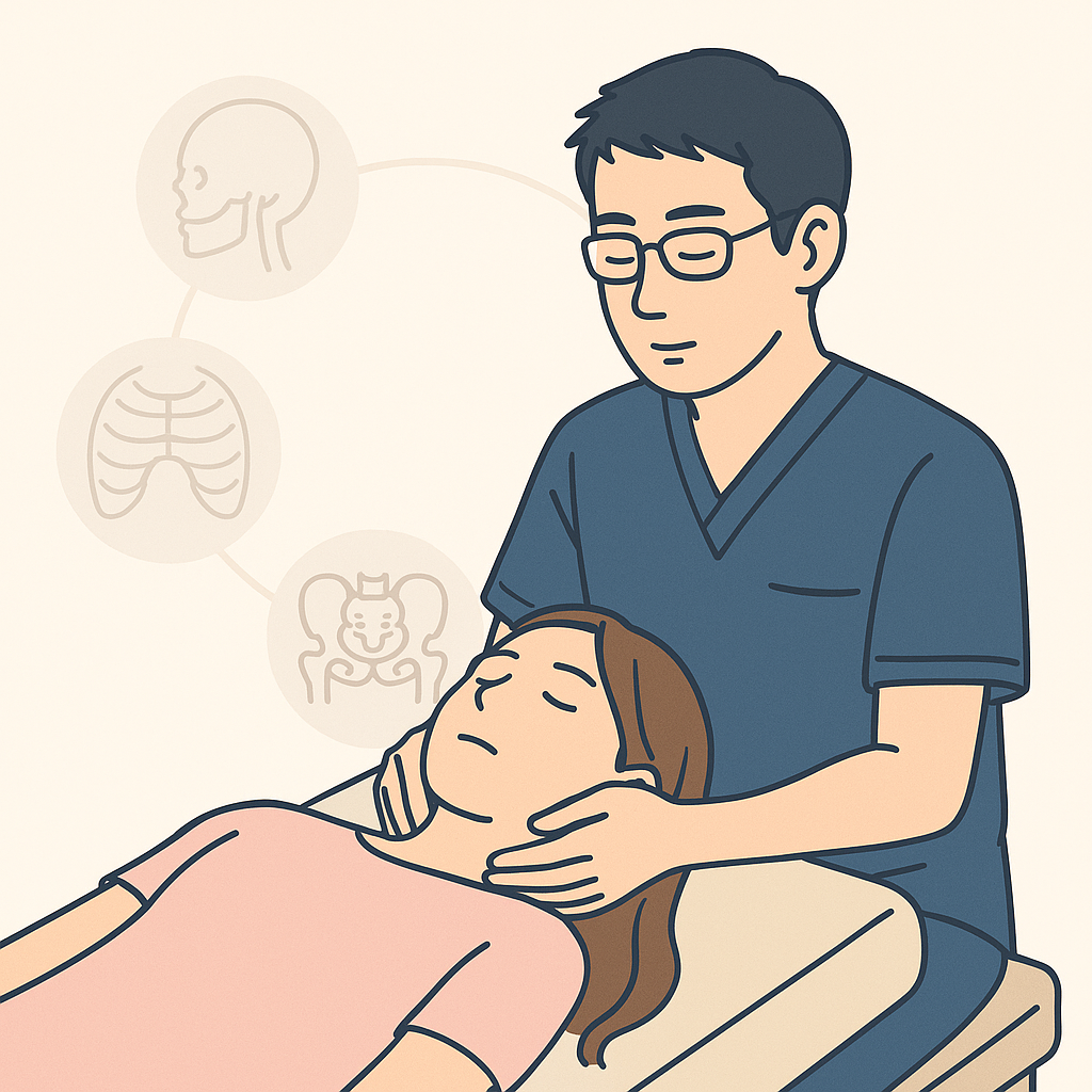 頸部〜鎖骨下、胸郭、横隔膜の緊張は神経と血流の“通り道”を狭めます。全身を一つとして評価し、やさしい刺激で連動を整えて迷走神経と循環を回復。“震えが鎮まりやすい土台”をつくります。
