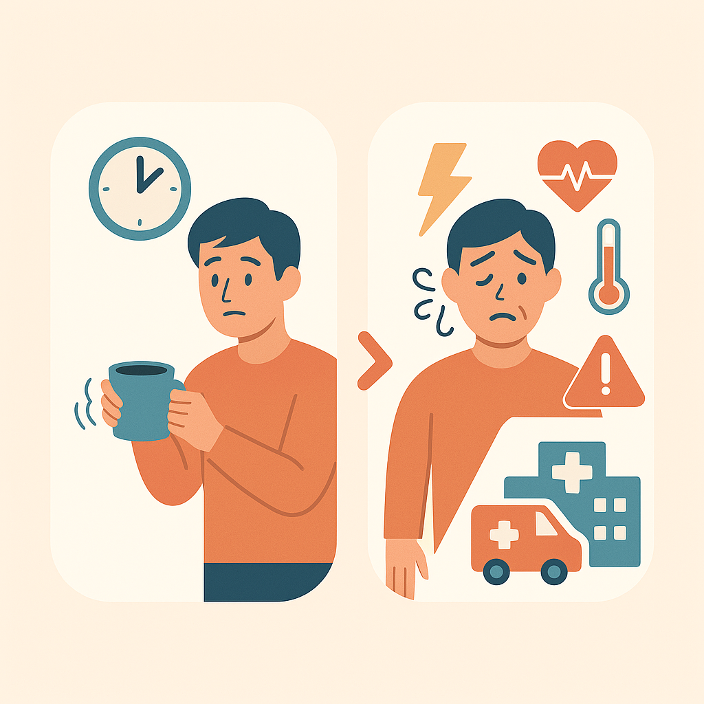 「特定の時間や動作のときだけ震えるのか?」をまず確認。突然の強い震えに加えて他の症状(片側の脱力・ろれつ不良・激しい頭痛・動悸や息切れ・発熱など)が出る場合は受診してください。 不安が続くときも専門家へご相談を。