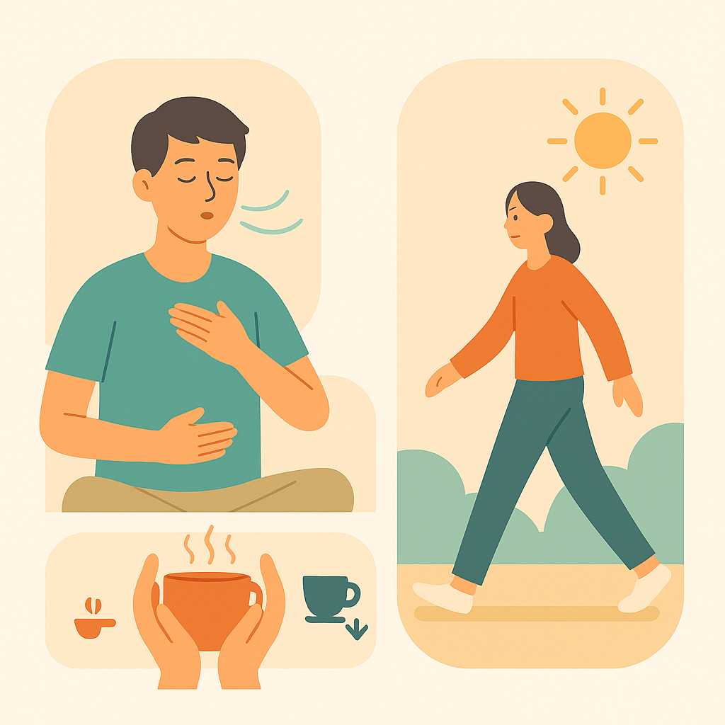 朝食を抜かない/甘い飲料に頼りすぎない。コーヒー・エナジードリンクは控えめに。鼻から吸ってゆっくり長く吐く呼吸を1分、指先を温め、手首・肘・肩をやさしく回して巡りを促しましょう。朝の光10〜15分も有効です。