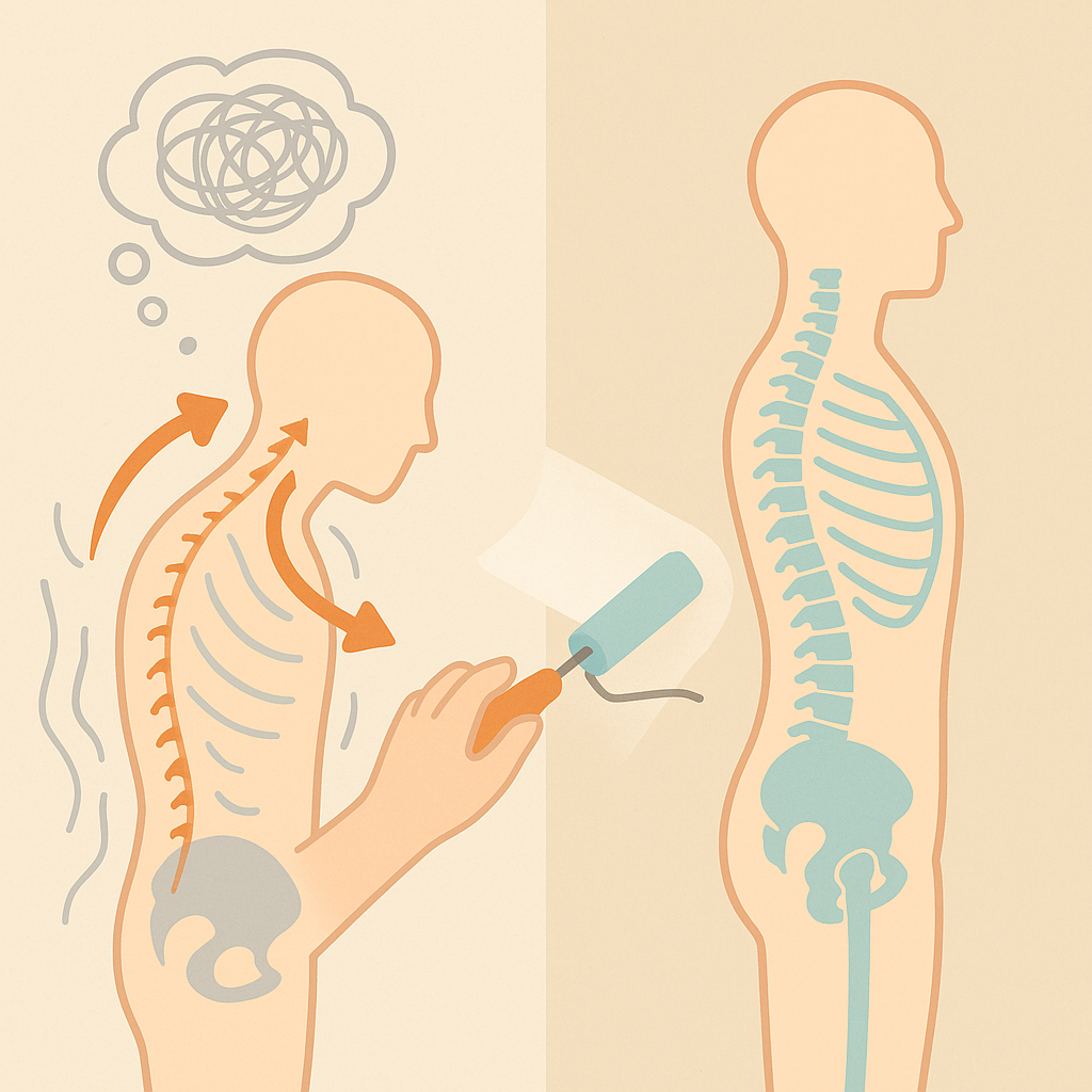 **急性(例:ぎっくり腰)**は炎症と保護収縮が主。無理を避けつつ、呼吸と骨盤・胸郭の可動をやさしく回復すると早く落ち着きます。