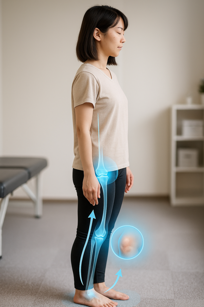 膝に水(関節液)が溜まるのは、摩擦や炎症から関節を守るための自己防御。まず足部のアーチ・母趾の使い方・足首の向きが崩れていないかを確認しましょう。アーチをつくり、足〜膝〜股関節の荷重ラインを整えるだけで、痛みや腫れが引く例は少なくありません。オステオパシーでは「身体は一つ」。足元と骨盤、胸郭の連動まで評価します。